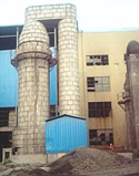 主要由文丘里、主筒體、上部注水槽、下部溢水孔、清理孔、副筒體和連接煙道(鋼混結構)等組成,其工作原理是:含塵氣流通過進口煙道進入文丘里,在喉部的入口被水均勻的噴入,由于煙氣高速運動,因此噴入的水被其溶化成細小的水霧,濕潤了煙氣中的灰料。在這個過程煙氣中的灰料被濕潤,使它的重量加大而有利于被離心分離,在高速呈絮流狀態中,由于水滴與塵粒差別較大,它們的速度差也較大。這樣,灰粒與水滴就發生了碰撞凝聚,尤其是粒徑細小的灰塵料可以被水霧水溶,這些都為灰料的分離做好充分的準備,此后進入主筒。脫硫除塵設備的主筒體是一個圓形筒體,水從除塵器上部注水槽進入主筒,使整個圓筒內壁形成一層水膜從上而下流動,煙氣由筒體下部切向進入,在筒體內旋轉上升,含塵氣體在離心力作用下始終與筒體內壁面的水膜發生摩擦,這樣含塵氣體被水膜濕潤,塵粒隨水流到除塵器底部,從溢水孔排走,在筒體底部封底并設有水封槽以防止煙氣從底部漏出,有清理孔便于進行筒體底部清理。除塵后廢水由底部溢流孔排出進入沉淀池,沉淀中和,循環使用。凈化后的氣體,通過主筒體上部錐體部分進行脫水處理進入副筒后再進行沉降、分離脫水后,凈化后的煙氣通過副筒體下部排入引風機,完成除塵設備的工作過程。