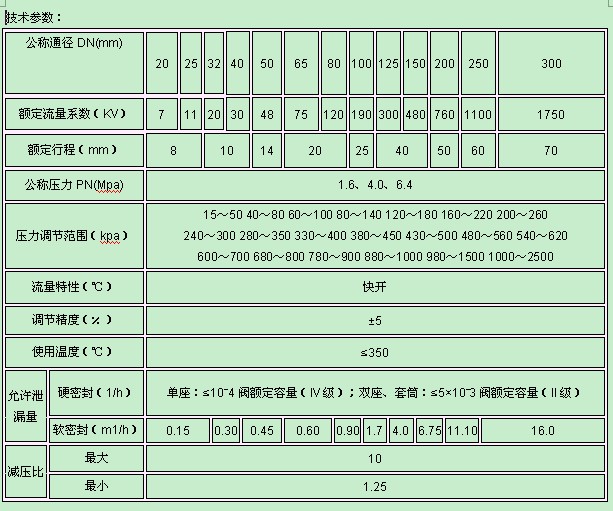 本系列產品有單座(ZZYP)、套筒(ZZYM)、雙(ZZYN)、三種結構;執行機構有薄膜式、活塞式二種;作用型式有減壓用閥后壓力調節(B型)和泄壓用閥前壓力調節(K型)。產品公稱壓力等級有PN16、40、64;閥體口徑范圍DN20~300;泄漏量等級有II級、IV級和VI級三檔;流量特性為快開;壓力分段調節從15~2500Kpa。可按需要組合滿足用戶工況要求。