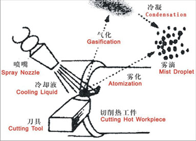 加工過程中金屬切削液油霧的形成的主要原因是霧化和蒸發:霧化是機械能轉化為液滴表面能的過程,主要是由于液體對機床系統內的固定及旋轉單元的激烈沖擊,被其打碎,形成細小液滴漂浮在工作環境中;蒸發的發生是由于切削區產生大量的熱量,這些熱量傳入切削液使它的溫度明顯高于飽和溫度,在固--液接觸面上就發生沸騰并產生蒸汽。這些蒸汽隨后與周圍空氣中的小液滴或其它粒子為核心凝結 ,形成油霧 。