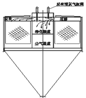 該除塵器的左右兩側過濾單元各5個室,共10個室。中間上部為反吹清灰系統;中部為凈化煙道和塵氣通道;下部為漏斗、排灰閥,除塵器的濾袋為菱形,由29個菱形組成一條濾袋,兩濾袋間排列間隙小,由12條菱形濾袋排列為一個過濾單元,類似蜂窩狀,亦可稱蜂窩狀袋式除塵器。