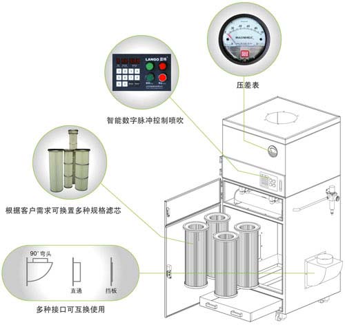含有粉塵的空氣經由收塵口吸入集塵箱,粉塵被阻隔在過濾器的外壁,凈化后的空氣經過濾器的內筒、風機葉輪排入大氣。壓縮空氣在電磁閥控制下,以脈沖形式噴吹過濾器,將吸附在外壁的粉塵抖落于集塵抽屜內,以保持過濾器穩定的集塵效果。