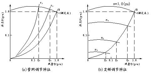 需要特別強調的是一般采用節流裝置來調節流量。但當實際風機流量比需要流量大很多時,這種方法浪費電力過多,很不經濟。當節流裝置全開時,流量仍嫌過小,此時節流裝置已失去作用,故應設法改變管網,使阻力系數減小以增加流量。很顯然,采用在電機功率及葉輪強度允許的條件下增加或降低風機轉速,即變頻調速來調節系統流量,是最為簡單可靠的辦法。如圖一,變頻調控風量與管網調控風量的區別。