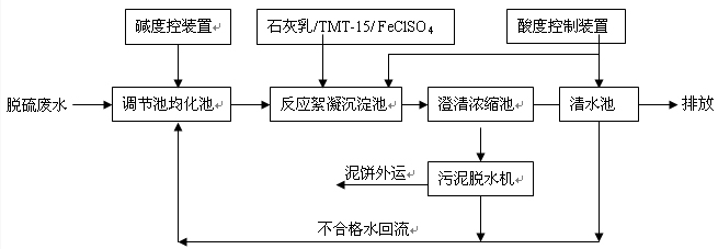 3)絮凝反應 經前2步化學沉淀反應后,廢水中還含有許多細小而分散的顆粒和膠體物質,所以在第3隔槽中加入一定比例的絮凝劑FeClSO 4 ,使它們凝聚成大顆粒而沉積下來,在廢水反應池的出口加入陽離子高分子聚合電解質作為助凝劑,來降低顆粒的表面張力,強化顆粒的長大過程,進一步促進氫氧化物和硫化物的沉淀,使細小的絮凝物慢慢變成更大、更容易沉積的絮狀物,同時脫硫廢水中的懸浮物也沉降下來。