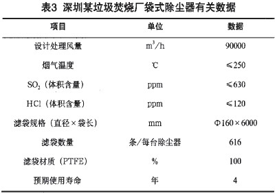 深圳某垃圾焚燒廠應用PTFE濾袋的袋式除塵器情況見表3。