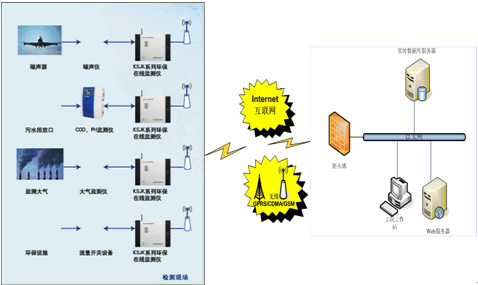 工況在線監控系統由前端探測設備、傳輸設備及中心接收設備組成。前端探測設備包括除塵設施監控系統及水處理設施監控系統等,傳輸設備采用無線或有線傳輸方式,中心通過網絡接收信息,通過TCP/IP方式實現與中心計算系統和軟件系統的數據交互功能。