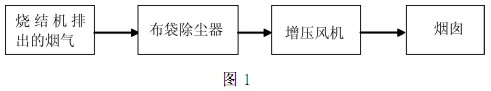 在現階段,我國大型鋼廠的燒結機在燒結過程中會排出大量煙氣,其中會含有氮氣,二氧化硫,二惡英,粉塵等物質。以280平方米的燒結機為例,其排到大氣的物質中,含粉塵濃度150mg/Nm3,按此計算,將會給環境造成很大的污染,目前,我國對節能減排制定了詳細的要求及標準,對環境保護法規在不斷的完善,對環境保護提出了更高的要求,按我國現行標準要求,排入大氣的粉塵濃度必須低于50mg/Nm3,而加布袋除塵裝置是實現這一要求的重要環節。 其工藝簡圖如圖1所示。