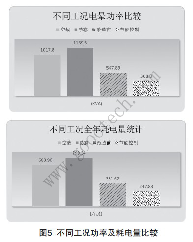 經對電除塵器改造前后的運行數據進行調查,分別統計了電除塵器空載運行、熱態(負載運行,未節能)、改造前(人工節能,停一半電場)、改造后(自動節能,電場全開)等不同工況的功率情況,以及不同工況下電除塵器消耗的電量(按電廠每臺爐電除塵器全年280天可利用小時數=6700小時計算),如圖5所示。