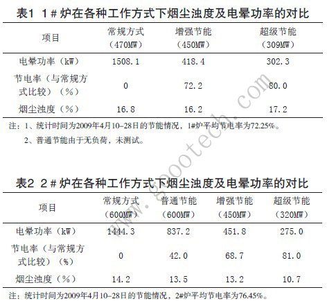 2009年初,電廠對電除塵器的電控設備進行了節能改造,應用新型電除塵器節能優化控制系統,引入鍋爐負荷等信號,對電除塵器電控部分進行整體升級改造,使所有設備能夠根據運行工況及變化自動進行調節,所有參數運行在最佳狀態,實現節能提效,圓滿達到了改造目的。經測試,改造后兩臺爐的除塵效率分別為99.76%、99.53%,均超過99.5%的保證效率,節能率在65%以上,除塵效率較改造前有一定提高,整個節能改造順利達到了節能增效的目的。