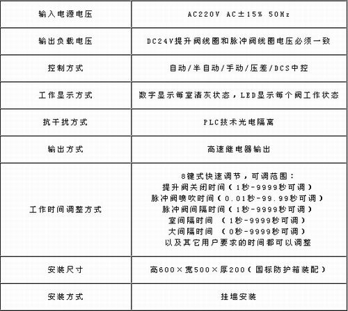 脈沖控制儀是脈沖(低壓長袋)袋式除塵器噴吹清灰的主要控制裝置。它的輸出信號控制電磁脈沖閥對濾袋進行循環清灰,以保證除塵器的處理能力和收塵效率。該產品的脈沖間隔、脈沖寬度、輸出位數、脈沖周期間隔可調,數據可用數顯管顯示,輸出位數可根據需求進行擴展,具有時序控制和壓差控制兩種控制方式。實用性全面取代PLC,適用于控制各種大中型行噴高溫、低溫脈噴型在線、離線噴吹袋除塵器,N提升閥+N脈沖閥控制,可選冷風閥溫度自動控制 每臺64路輸出。輸出路數:8-200路設計,每1提升閥為1路,每1脈沖閥也為1路,可以是1提升閥+5/8/10/多個脈沖閥控制。