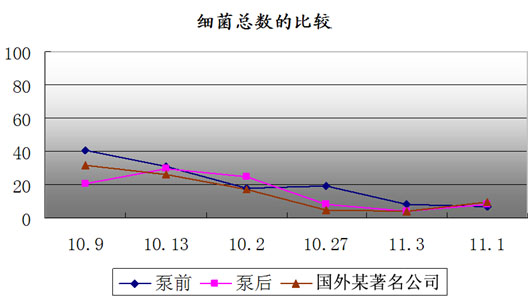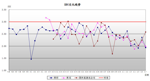 從圖中可以看出,SDI是達標的,一般情況下小于3,只有最初兩天檢測泵后產水SDI大于3,這可能是最初剛檢測時,管道內比較臟的原因。相比較而言,國外公司設備的SDI稍好一些,但差距不大,全都滿足反滲透系統的進水要求。
