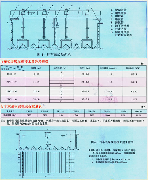 本機由四點支撐橫跨在平流池上,池子兩邊鋪設軌道,刮泥機沿池臺上的軌道運行,刮泥機運行時,刮泥板運行時,刮泥板將泥砂刮入集泥槽中,刮渣板將浮渣刮入渣斗中;回程時,刮泥耙靠卷揚機構抬離池底,刮渣板靠電動推桿抬離水面,完成一個行程,刮泥機回到起始位置,根據污泥量由行程控制裝置及繼電器控制往返的次數。