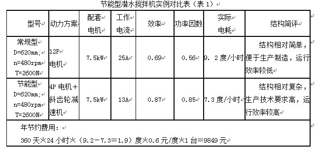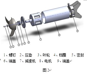 (二)節能動力--針對傳統潛水攪拌機的多級電機能效較低、電機體積大、成本高等問題,我們提出了常規四級電機配套一體化高效斜齒輪減速機的動力方案。改進后的節能型潛水攪拌機的主要組成部分有潛水電機、減速機、葉輪及安裝系統組成(圖2)。