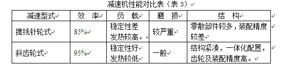 (二)、齒輪減速--由于傳統機型使用的擺線針輪減速器其固有結構原因及國內裝配質量原因,存在壽命較短、發熱高,效率差等問題。我們選用了高效的斜齒輪減速機,并解決了該型減速機的潛水密封、水下潤滑及一體化裝配等技術難題,使整機的綜合性能得到了有效提升,可見如下對比情況(表3)。