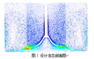 對比推流式攪拌機,我們研發了立體螺旋式攪拌方式,即雙曲面攪拌機。其體現為在雙曲面葉輪體上表面為雙曲線母線繞葉輪體軸線旋轉形成的雙曲面結構。其獨特的葉輪結構設計,最大限度地將流體特性與機械運動相結合。雙曲線的方程為xy=b曲線沿y軸旋轉而構成的曲面體;為了迎合水體流動,設計從葉輪的中心進水,這一方面減少了進水紊流,另一方面保證了液體對葉輪表面的壓力均勻,從而保證整機在運動狀態下的平衡。在漸開雙弧面上均布有八條導流葉片,借助液體自重壓力作補充進水獲得的勢能與葉輪旋轉時產生的離心力形成動能,液體在重力加速度的作用下經雙曲面結構過渡沿葉輪圓周方向作切線運動,在池壁的反射作用下,形成立體螺旋狀的循環水流[1],故可獲得在軸向(y)和徑向(x)方向的交叉水流(如圖3、4)。正是由于雙曲面攪拌機葉輪的結構特性和適當的安裝位置等特點,決定了它對懸浮物的防沉降均勻混合作用,在工作中可獲得理想的攪拌效果,能有效地消除攪拌死角。同時,由于其大比表面積葉輪可獲得大面積的水體交換。