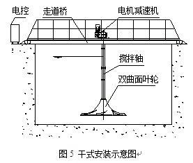 雙曲面攪拌機整機由動力部分、軸動軸、底座、雙曲面葉輪體及安裝附件組成,為了滿足用戶不同工況條件下的使用,將安裝設計為干式(也稱立軸式)和潛水式兩種(如圖5、6) 。