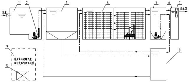 1:調節池 (不在設備內);2:潛污泵(一用一備);3:初沉池;4:三級接觸氧化池;5:二沉池(二只并聯使用);6:消毒池;7:消毒裝置;8:污泥池;9:風機房;10風機(二臺交替使用)。