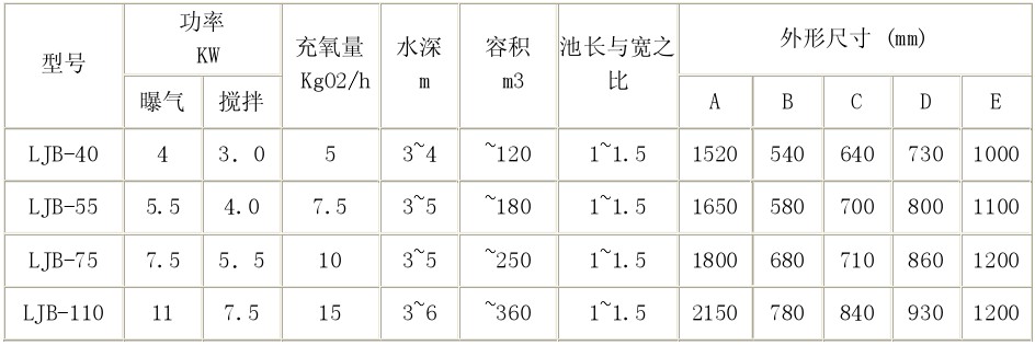 注:表中為清水狀態下P=101.325kpa、T=20℃,時的充氧能力