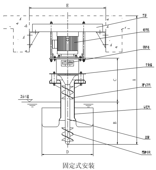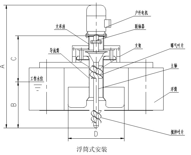 該設備主要由立式電機、支架、支撐管、葉輪及浮筒或固定支架組成。如圖所示: