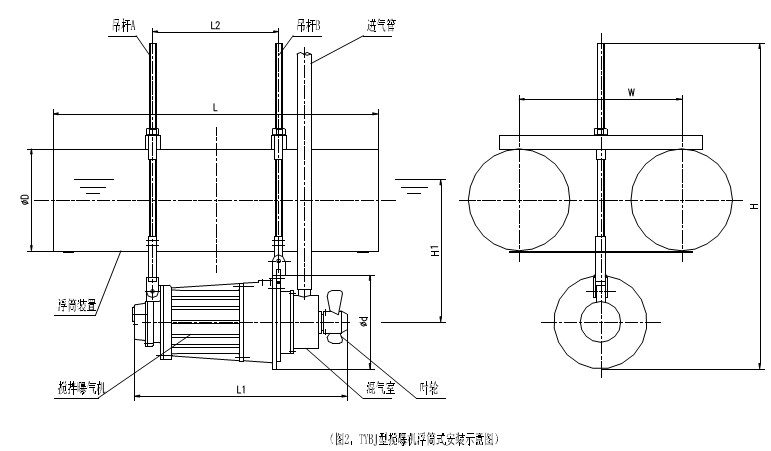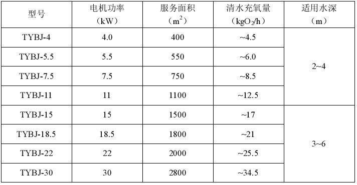 該機工作原理與TYBJ型攪拌曝氣機相同,結構上采用潛水電機,省去了中間長軸傳動機構,電機與曝氣機同軸,動力直接由電機傳遞至葉輪,大大提高了攪拌及充氧效率。
