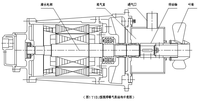 TYBJ型推流式液下攪拌曝氣機是在TYBJ型推流式攪拌曝氣機的基礎上,將立式戶外型電機改為潛水電機,整機潛入液下工作,避免了長軸傳動引起的結構復雜,效率下降等現象解決了電機的冷卻、電機周圍泡沫堆積引起的絕緣性能下降的一系列問題。
