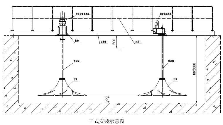 干式安裝的攪拌機先將減速機機架固定在工作橋上,然后只需依次安裝傳動軸,葉輪部件,并固定好電纜,見干式安裝示意圖。