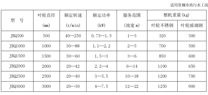 JBQ 型系列曲面攪拌機整機由驅動裝置和雙曲面葉輪體及安裝附件組成,為了滿足用戶不同工況條件下的使用,安裝分為干式(也稱立軸式)和潛水式兩種。干式安裝,將驅動裝置固定在工作橋上,通過傳動軸將動能傳至介質中的葉輪部件,它用于含固率高,水溫高,含有磨蝕性的液體中,由于葉輪具有自動糾偏功能,運行較平穩,減速機噪音小于 60 分貝。潛水式安裝,可免去橋架,采用潛水動力,利用設備自重定位,安裝靈活方便,適用在水深較深,且水質穩定,不含磨蝕性的水體,水溫不大于 40℃,PH 值6~9之間,其特點是無噪音,無視覺障礙。