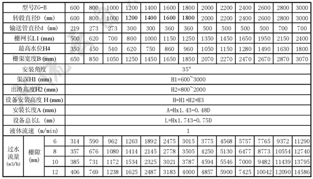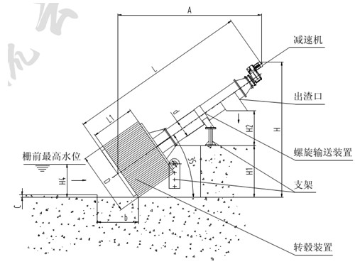 設備與水平面呈35°安裝在水渠中,污水從鼓的端頭流入鼓中,水通過柵網的柵縫流出,格柵將漂浮物和沉積物截留,隨著截流量的怎多,過濾面積越來越小,水頭損失逐漸增大,當轉轂內外水位差達到設定值時,除污耙自動回轉梳除柵渣,卸入鼓內德集渣斗內,由內置的螺旋輸送機提升,柵渣一邊上行一邊瀝水,至頂端壓榨及擠壓脫水,卸入貯渣容器中,外運處理。