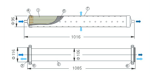 ①中空纖維膜 ②不銹鋼外殼 ③膜組件端蓋