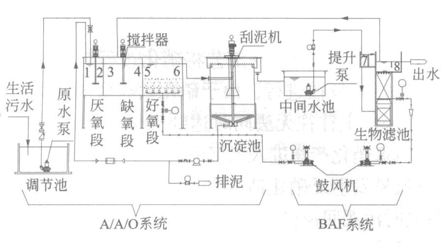 這種技術是A2/O工藝與曝氣生物濾池工藝相結合的一種工藝,其特征是:A2/O工藝好氧段改進為氧保持段,在氧保持段只需維持溶解氧的濃度在 2.0mg/l左右,氣水比一般小于1∶1,污水中的氨氮不進行硝化反應;A2/O工藝的出水經二沉池進行泥水分離后,上清液再進入曝氣生物濾池進行深度處理,曝氣生物濾池內安裝填料,在該池內進行氨氮的硝化,硝化液由曝氣濾池回流到前置的缺氧段中進行反硝化,從而在缺氧段實現氨氮的去除;二沉池產生的污泥部分返回前置的厭氧段進行除磷。