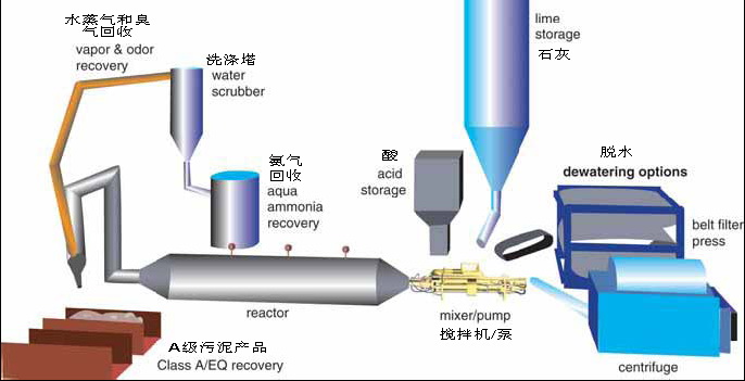 該工藝混合了脫水污泥和生石灰以及酸,是一個堿性污泥穩定系統技術。整套系統包括污泥脫水設備,石灰存儲,混合攪拌系統,酸存儲,反應器,水洗滌器和臭氣回收系統。BIOSET過程中,處理的污泥連續被雙缸柱塞泵送入栓賽流反應器,在反應器中用石灰和固體酸來同脫水污泥混合攪拌,污泥和化學物料在全封閉的壓力作用下發生反應,最終產出A/EQ級污泥產品。反應器的溫度應控制在70℃,生物污泥通過提升和維持高溫達到巴斯德殺菌要求,即消滅有害病菌。這種專利過程把生石灰轉變為的熟石灰,最快速形成最有價值的鈣結構。而產生的臭氣則被小型洗滌系統搜集且無泄漏。