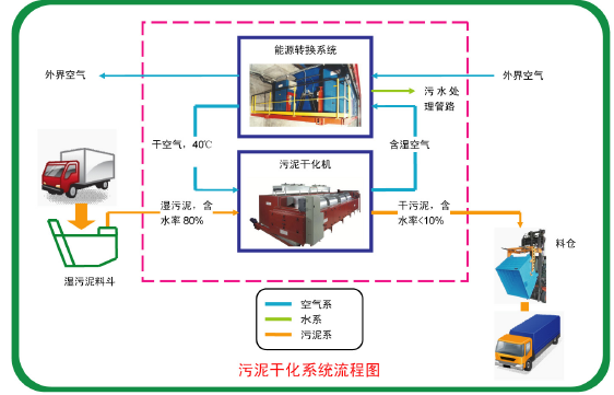 威特普低溫干化系統用于經過污泥脫水機處理后的脫水泥餅,對其進行干化處理。污泥餅通過注入系統內部的干熱空氣在系統內的循環流動來對污泥進行干化。含濕氣體通過污泥儲藏室頂部的一個冷卻系統來除濕,經過冷凝處理后的氣體進行二次加熱再次注入到污泥干化裝置的干化室中。密閉回路的干化系統不會向外界空氣排出廢氣。