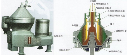當液體到達離心力最大的分離區域時,液體的流向將發生改變而流向轉鼓的中央,并在那里在一個固定的削減盤產生的壓力作用下排出。在通過碟片時,固體顆粒向碟片下側運動,然后朝轉鼓內壁運動,并積聚在固相沉積室。