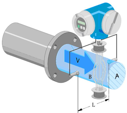 假設電磁感應線圈產生磁場強度(B)為恒定,產生的感應電壓(Ue)正比于流體速度(v),管道截面積(A)為已知,則體積流量(Qv)則可通過如下公式計算: