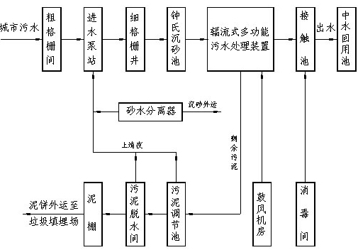 工程采用水解-AICS處理工藝。其具體流程為:污水首先分別經過粗格柵去除粗大雜物,接著污水進入泵房及集水井,經泵提升后流經細格柵和沉砂池,然后進入水解池,。水解池出水自流入AICS進行好氧處理,出水達標提升排入河流。AICS反應器為改進SBR的一種。其工藝流程如下圖1所示: