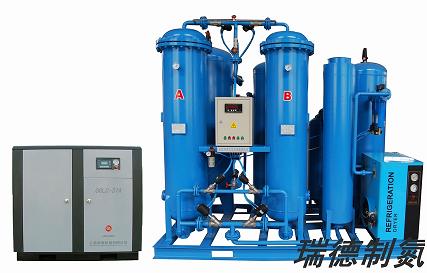 RDN系列制氮機是根據變壓吸附原理,采用高品質的碳分子篩作為吸附劑,在一定的力學效應,氧在碳分子篩微孔中擴散速率遠大于氮,在吸附未達到平衡時,氮在氣相中被富集起來,形成成品氮氣。然后減壓至常壓,吸附劑脫附所吸附的氧氣等其它雜質,實現再生。一般在系統中設置兩個吸附塔,一塔吸附產氮,另一塔脫附再生,通過PLC程序自動控制,使兩塔交替循環工作,以實現連續生產高品質氮氣之目的。壓力下,經過凈化干燥的壓縮空氣,在吸附器中進行加壓吸附、減壓脫附。