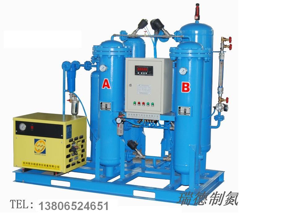 RDN系列制氮機是根據變壓吸附原理,采用高品質的碳分子篩作為吸附劑,在一定的力學效應,氧在碳分子篩微孔中擴散速率遠大于氮,在吸附未達到平衡時,氮在氣相中被富集起來,形成成品氮氣。然后減壓至常壓,吸附劑脫附所吸附的氧氣等其它雜質,實現再生。一般在系統中設置兩個吸附塔,一塔吸附產氮,另一塔脫附再生,通過PLC程序自動控制,使兩塔交替循環工作,以實現連續生產高品質氮氣之目的。壓力下,經過凈化干燥的壓縮空氣,在吸附器中進行加壓吸附、減壓脫附。