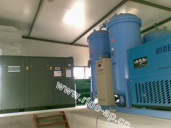 RDN系列制氮機是根據變壓吸附原理,采用高品質的碳分子篩作為吸附劑,在一定的力學效應,氧在碳分子篩微孔中擴散速率遠大于氮,在吸附未達到平衡時,氮在氣相中被富集起來,形成成品氮氣。然后減壓至常壓,吸附劑脫附所吸附的氧氣等其它雜質,實現再生。一般在系統中設置兩個吸附塔,一塔吸附產氮,另一塔脫附再生,通過PLC程序自動控制,使兩塔交替循環工作,以實現連續生產高品質氮氣之目的。壓力下,經過凈化干燥的壓縮空氣,在吸附器中進行加壓吸附、減壓脫附。