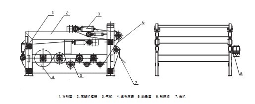 帶式壓濾機(DYQ型)主要功能是脫水,污泥通過一系列的壓輥、輥筒及上下兩層壓緊濾帶,使濾帶上的污泥在剪切力的作用下壓榨脫水,從而使毛細水分離。一般分為三個階段:重力脫水段,楔形預壓榨段,中、高壓壓榨段。