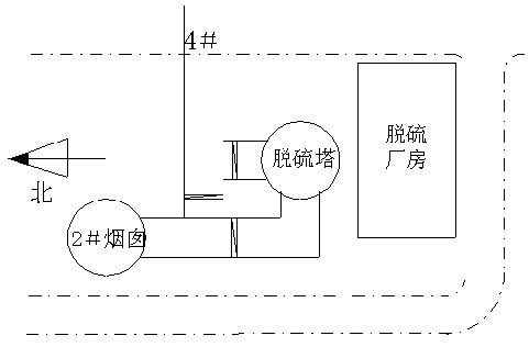 該廠原有3臺220T/h鍋爐,共用一個煙囪,1#煙囪。在原有3#爐的北側,建設4#鍋爐,260T/h。煙氣經過機組的電除塵和引風機后,分為兩路,一路經過切斷擋板門直接進入脫硫塔,一路稱為旁路,設有旁路擋板門。在脫硫裝置有故障和機組點火期間,煙氣走旁路直接進入煙囪。整個脫硫裝置的面積在20×25m2左右。