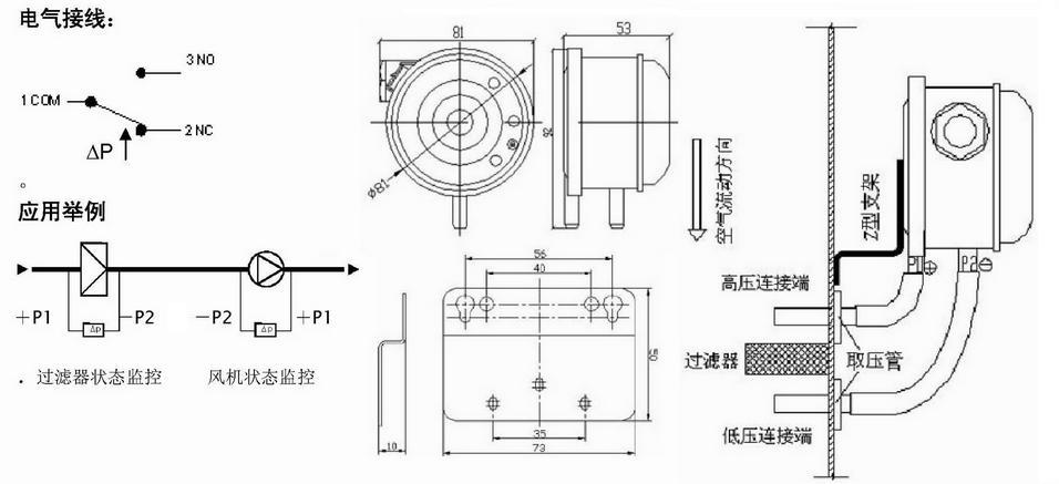 裝配說明:只要保證裝配面震動最小或沒有震動,壓差開關可以直接固定在管道、加熱器或空調機組的面板上。為保證動作的精確性,壓差開關應垂直安裝,這樣可以使其內部的氣膜自重不影響產品精度。壓力連接位置標注:+(高壓),和-(低壓或靜壓)。