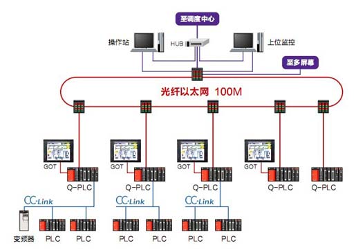 該污水處理廠自控系統采用基于PLC的集中監控和數據采集(SCADA)系統。根據工藝要求,主體結構由中央控制室的上位機管理監控通過100M光纖以太網(Ethernet)與五個現場控制主站構成冗余環,各個分站采用CCLINK將集中檢測、分散控制融為一體,真正實現全廠工業級的智能控制。