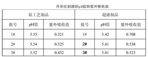 中藥的有效成分絕大多數是分子量在1000以下的小分子, 而造成中藥注射液澄清度不良的雜質(淀粉、蛋白質、鞣質等)和熱原均屬大分子。根據不同品種選擇合適的超濾膜, 可以有效地將兩者分離, 達到保留有效成分, 去除雜質和熱原的目的。以下是應用于丹參注射液與原工藝的質量對比