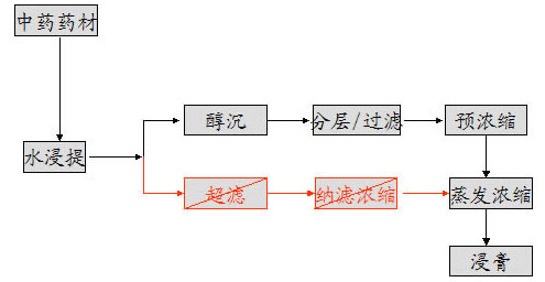 1、對于水提醇沉的工藝,可以利用合適的膜分離組合技術替代原工藝中沉淀和預濃縮過程:水浸提工藝中,利用超濾澄清、除熱源,納濾濃縮代替預濃縮,節省能耗