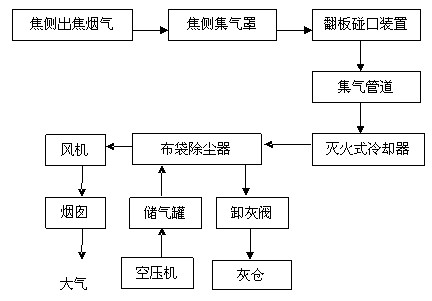 焦側設置一套集氣干管,管道對應每個碳化室的位置設有翻板閥及碰口裝置一套,同時攔焦車集氣大罩頂部也設有碰口裝置和推桿裝置。推焦開始前,攔焦車對位,集氣大罩頂部推桿裝置將集氣干管上的翻板閥推開,碰口裝置對位,推焦開始后產生的大量煙塵由熱浮力上升至集氣大罩頂部經由碰口裝置進入集氣干管并最終被引至地面站處理。