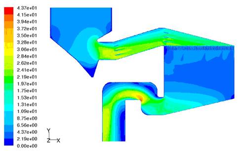 針對太倉發電廠SCR反應器現場布置空間十分有限的問題,充分發揮OI2-SCR核心技術的優勢,對連接煙道的流體流動、混合擴散及傳熱傳質過程進行數值模擬,以獲取有益的參數為應用于工程。首先建立計算用實體模型,由于結構的對稱性,分析中僅對實際模型的一半進行了分析,圖2為與催化反應器連接煙道(反應器進、出口段)內流場分布圖。在工程中,合理的設置導流板,以期達到最佳的流場分布,為催化反應提供充分的條件。