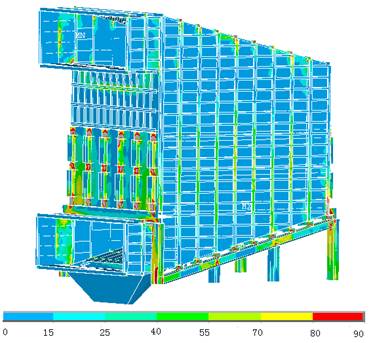 CAE分析的步驟先是建立反應器模型,然后對模型進行網格劃分,再此基礎上進行計算分析。由于反應器結構復雜,幾何形狀不規則,板殼的厚度多變,所以自己定義單元尺寸的大小,而不完全采用智能網格劃分,以便于控制局部的細節。載荷施加是比較復雜的。要依據一定的順序施加外壓、自重、催化劑重量、風載荷、地震載荷、溫度載荷,最后按現場條件施加約束。尤其注意的是,催化劑的承重梁與框架之間在水平方向可以相互滑動,在豎直方向則受到約束,二者之間在水平方向上有摩擦力相互作用。因此,在該處施加約束時應特殊處理。