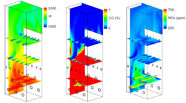 現代力學及計算機技術的發展使得復雜的流動、換熱、化學反應的數值預測成為可能,如今采用計算流體動力學軟件和化學反應動力學軟件CHEMKIN的耦合可以實現內鍋爐內的NOx生成進行比較精確的模擬,這對SNCR工藝溫度窗口的選擇和控制顯得尤為重要。圖3給出了鍋爐內的溫度、CO和NOx的CFD模擬結果。