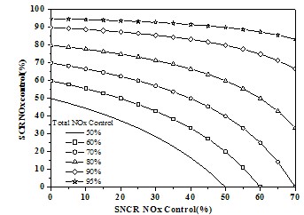 SNCR/SCR聯合煙氣脫硝技術結合了兩者優勢,將SNCR工藝的還原劑噴入爐膛,用SCR工藝使逸出的NH3和未脫除的NOx進行催化還原反應。典型的聯合裝置能脫除84%的NOx,同時逸出NH3濃度低于10ppm。圖2給出了SNCR/SCR聯合工藝NOx的理論脫除效率曲線,橫坐標和縱坐標分別表示單純采用SNCR或SCR工藝時NOx的脫除效率,從圖中可以看出,如果要達到50%的總脫除效率,并假如SNCR的效率為20%,那么SCR的效率只要不低于37.5%就能滿足要求。應當指出的是,圖2并未考慮低氮燃燒器或燃燒改進引起的氮氧化物脫除,假如該效率以50%計,SNCR和SCR的效率分別為20%和37.5%,那么總的NOx效率將高達75%。該分析方法也同樣適合于其它聯合工藝效率的估計,然而應當注意的是總的投資成本和運行費用并不一定由于聯合工藝的采用而降低,煙氣脫硝工藝的選擇應根據具體的鍋爐型式和負荷、煙氣條件和NOx濃度、需要達到的效率、還原劑供給條件、場地條件、預熱器和電除塵器情況、FGD裝置特點等因素綜合考慮,以達到最佳的技術經濟性能。