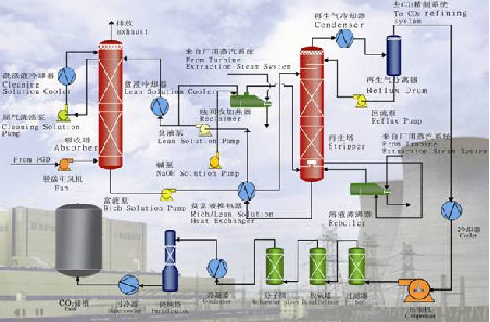 針對燃煤電廠煙氣中CO2濃度低、O2含量和粉塵濃度高等特點,采用化學吸收法進行CO2的捕集。在低溫條件下用化學溶劑吸收煙氣中的CO2;溶液加熱時,CO2從化學溶劑中解析出來,得到高濃度的CO2,溶液循環使用。