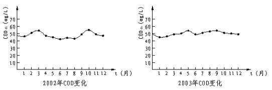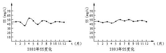 對2002年和2003年排放水COD、TSS、BOD和pH的月度平均值我們進行取樣分析。對COD和TSS如下圖2和圖3所示,BOD和pH如表四所示。